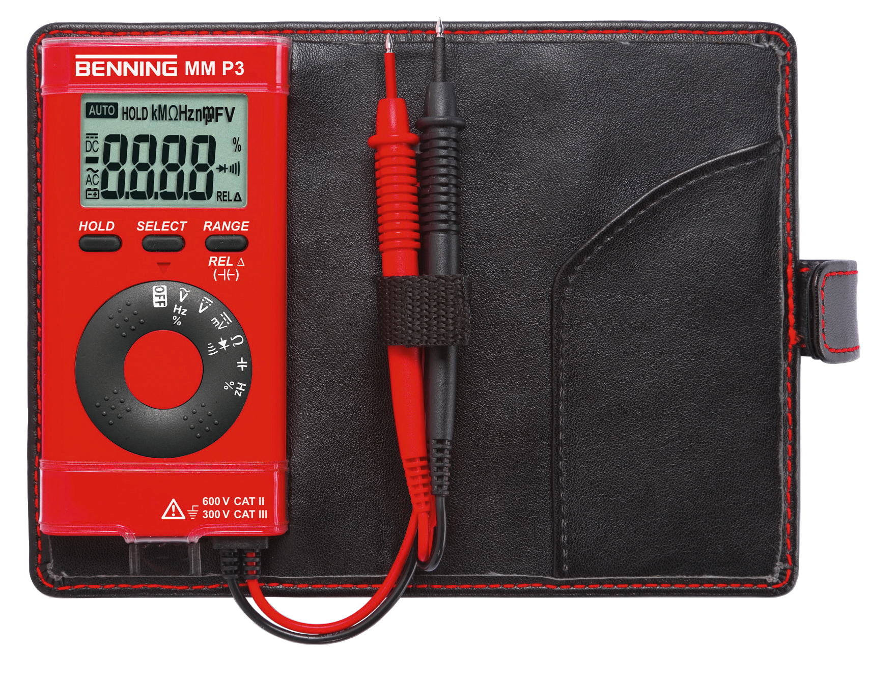 • Inclusief lederen etui, vast aangesloten veiligheidsmeetsnoeren, batterijen (2 x LR44) en gebruiksaanwijzing